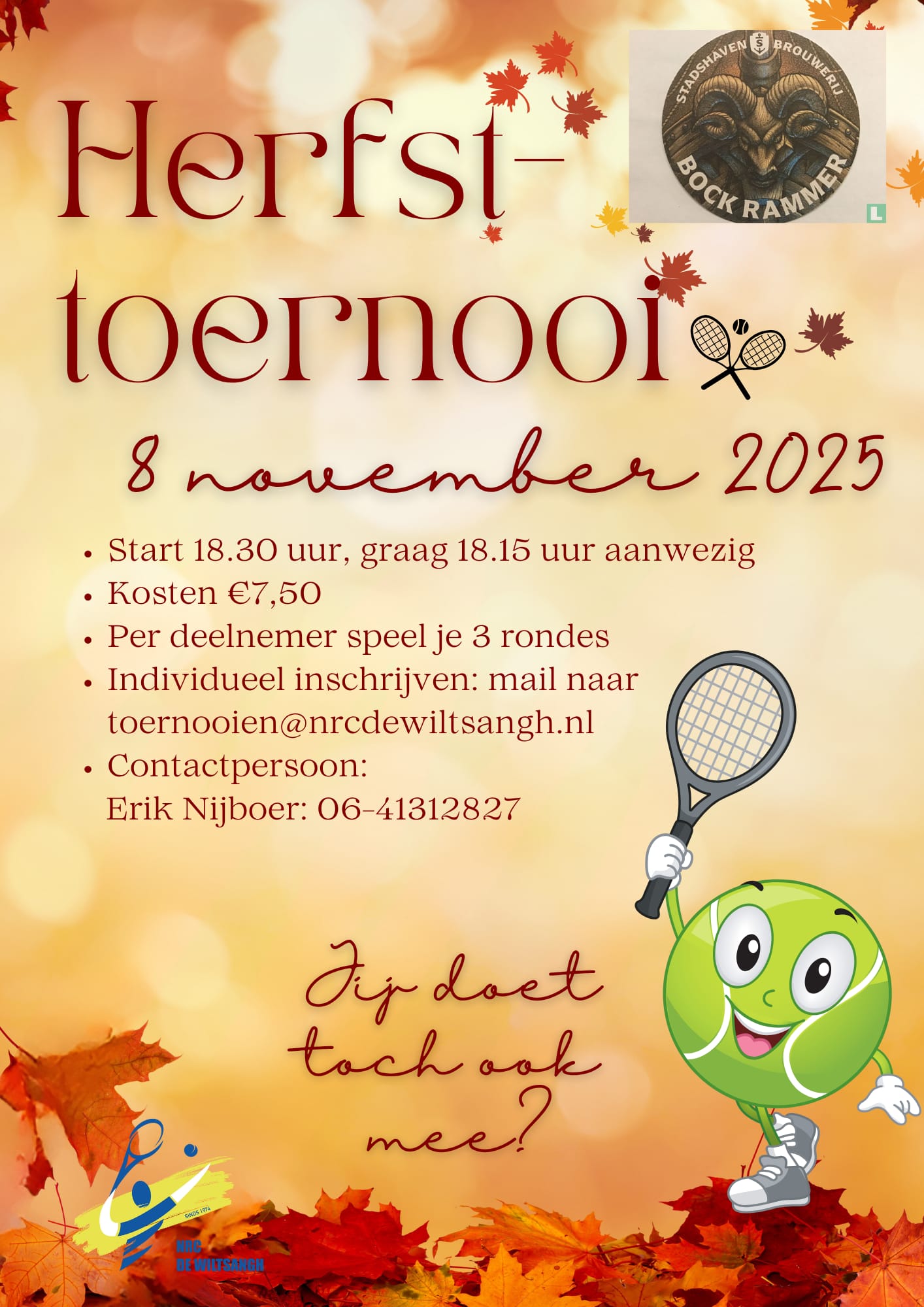 Op zaterdagavond 8 november is er weer het Herfsttoernooi a.k.a. het Bockbier toernooi. Je mag je gewoon individueel inschrijven en dan maken wij er leuke partijtjes van.